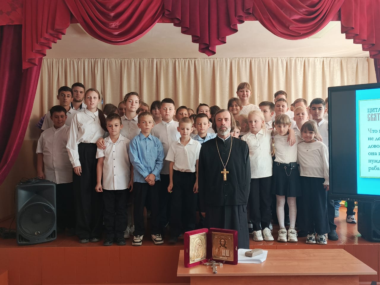 В МБОУ Апаринской школы настоятель Храма Иконы Пресвятой Богородицы "Неопалимая Купина " отец Александр, провёл беседу с учащимися 2- 6 классов на тему «Духовность и нравственность в современном мире».