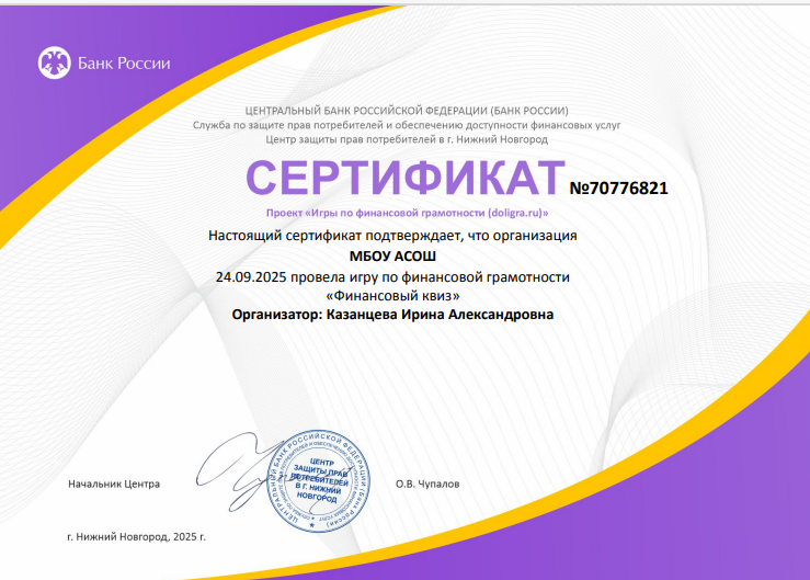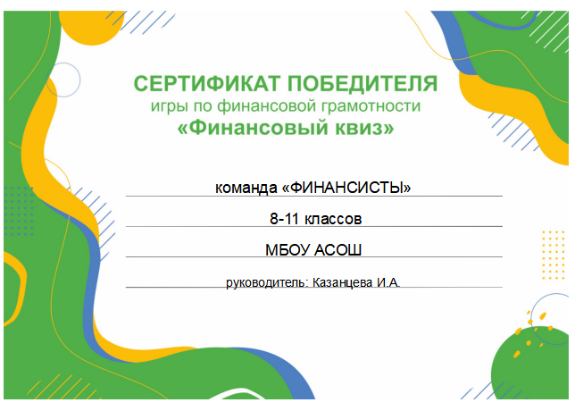 «Банк Росси», стартовал серию игр, по Финансовой грамотности, в которой МЫ, учащиеся МБОУ АСОШ, каждый год, вместе с нашим руководителем Казанцевой И.А., принимаем самое активное участие, вот уже сегодня, мы ИГРАЛИ! Командная интеллектуально-развлекательная игра. В Финансовом «КВИЗе», нам предложили погрузиться в мир финансов, денег и экономики. Эта игра позволила не только приятно провести время, разгадывая вопросы на финансовую тему, показать высокий уровень работы в команде, но и улучшить свои знания в области финансовой грамотности!