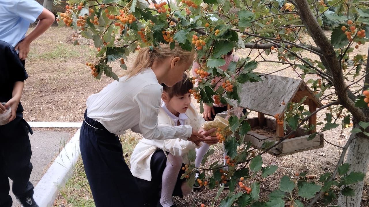 4. Маленькие первоклассники отремонтировали кормушки и покормили цтиц в школьном саду.