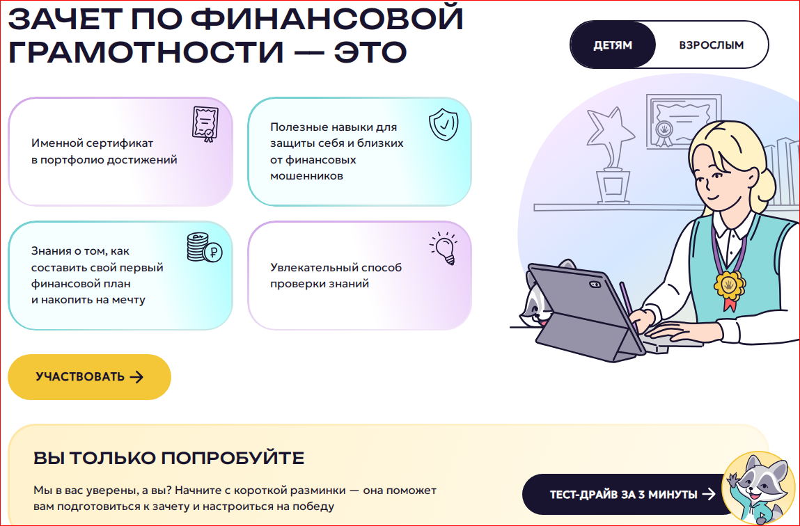 Зачет можно пройти индивидуально или всей семьей. Задания подготовлены на основе конкретных жизненных ситуаций и помогают научиться принимать рациональные финансовые решения. Для тех, кто уже отлично ориентируется в финансовых вопросах, предусмотрен продвинутый уровень сложности.
