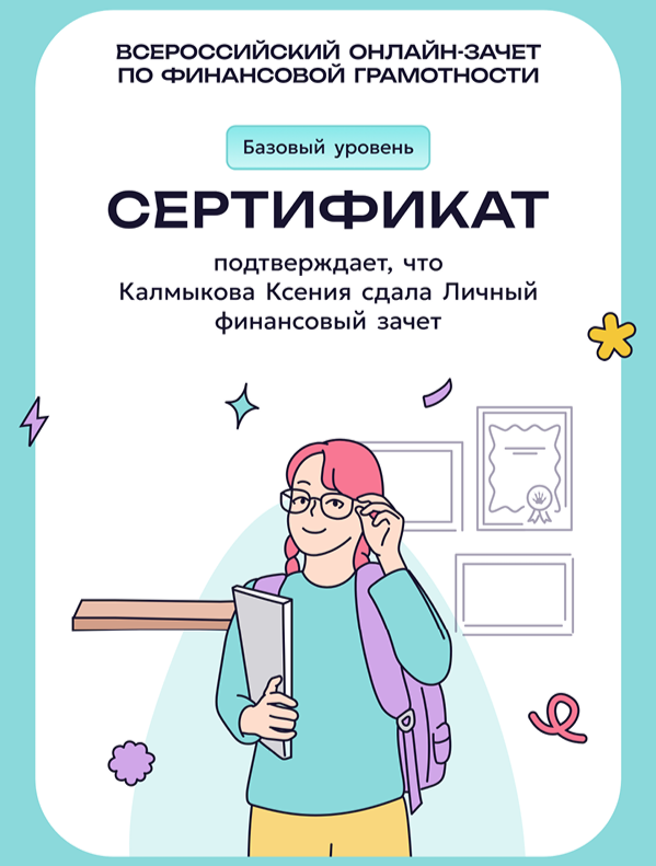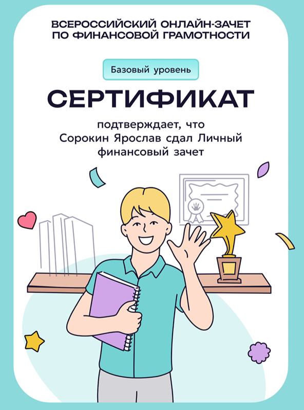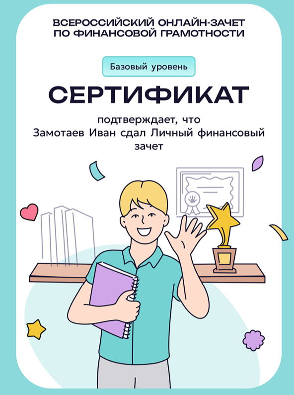 7 октября 2025г. Всероссийский онлайн-зачет по финансовой грамотности можно пройти с 7 октября по 28 октября. Это возможность проверить свои знания, получить полезные рекомендации и собрать коллекцию достижений. Каждый участник, успешно завершивший зачет, получит именной сертификат с личными результатами. Зачет можно пройти индивидуально или всей семьей. Задания подготовлены на основе конкретных жизненных ситуаций и помогают научиться принимать рациональные финансовые решения.